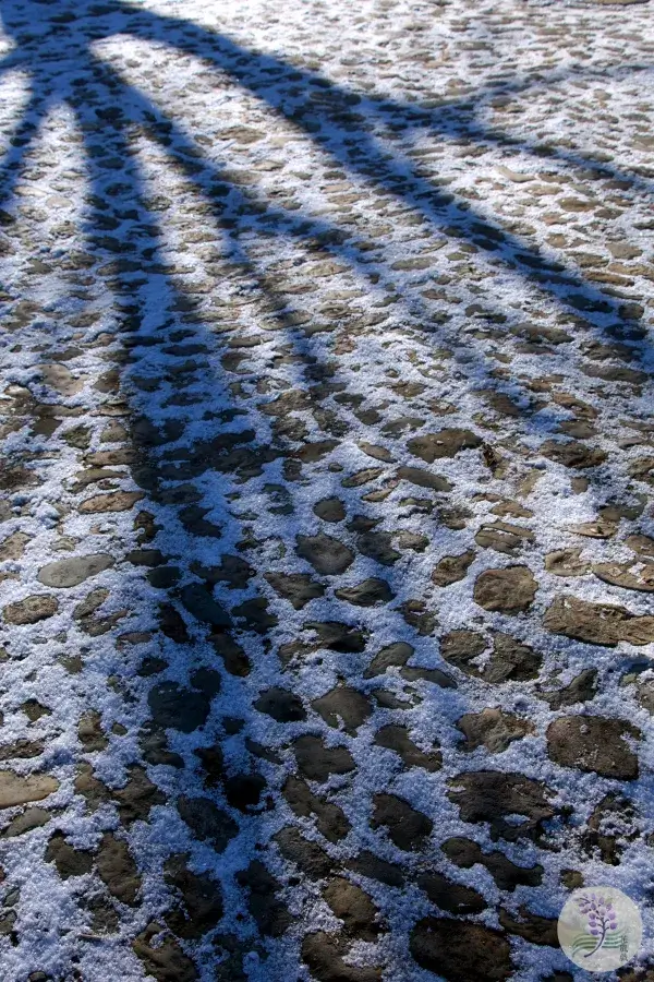 うっすらと道に残る雪と木の影
