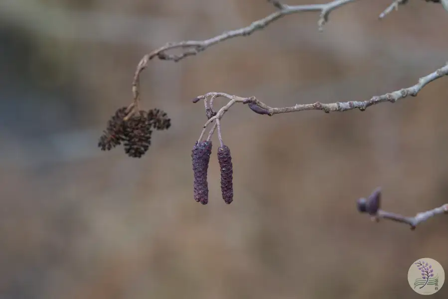 冬の終わり、葉が出る前に赤茶色の長い花をぶら下げます。水辺や湿った場所に多いです。松ぼっくりを小さくしたような去年の実が一緒に残っていることが多いです。