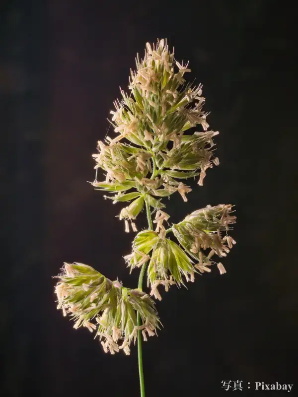 イネ科の中でも穂が長く、青みがかった緑色をしています。風に吹かれて波打つ姿は非常にフォトジェニック。花粉が飛ぶ時期は穂から小さな「しべ」が飛び出しています。