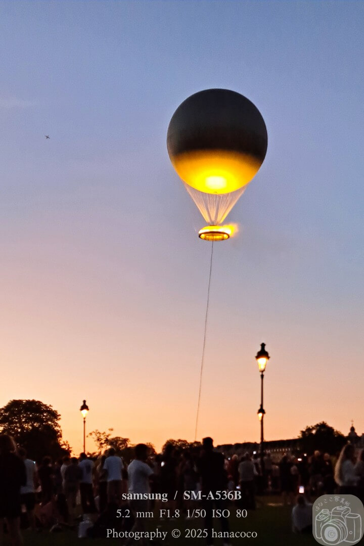 夕焼けに染まる空を背景に、銀色の気球と燃え上がる炎がゆっくりと夜空へ昇っていく様子は、とても力強く、心に深く刻まれる光景。